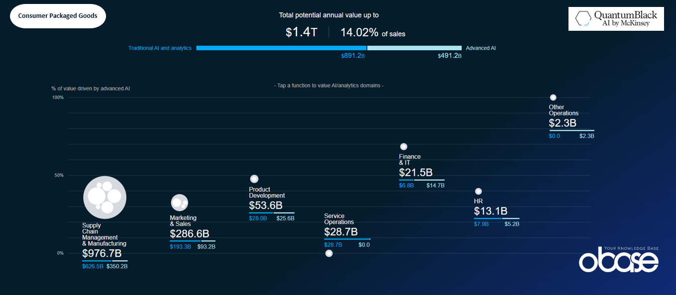 The total potential annual value of the CPG sector is $1.4 trillion, representing 14.02% of sales. Supply chain management is the largest value area at $976.7 billion, followed by marketing and sales at $286.6 billion.