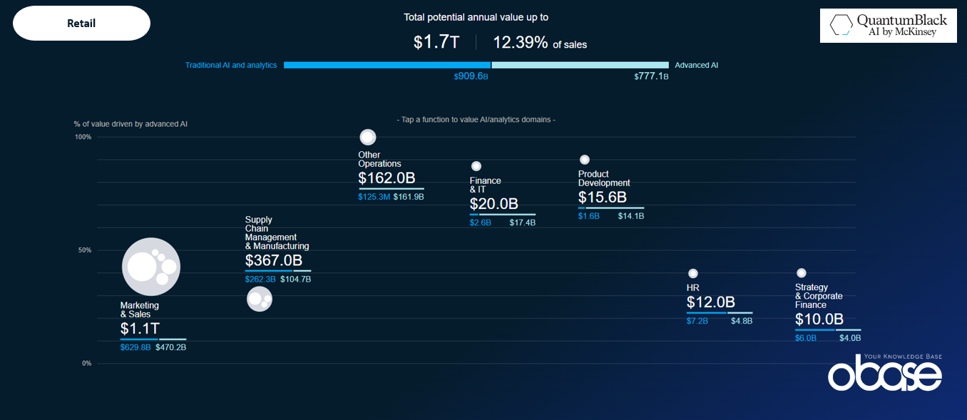 Returning to McKinsey's research, we see that the greatest value-added potential in retail lies in sales and marketing. By analyzing customer behavior in real time, AI can provide personalized product recommendations for each customer, optimize campaign timing, and instantly adjust pricing strategies.