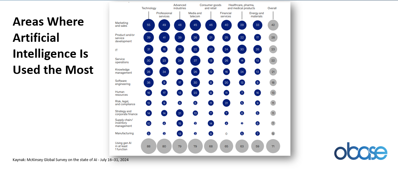 However, McKinsey's "Global Survey on the State of AI" research published in July 2024 reveals an interesting fact: Although the highest value creation potential appears to be in the retail and CPG sectors, when we look at the areas where artificial intelligence is used most, the sum of these two sectors ranks in the middle, at 5th place among other sectors.